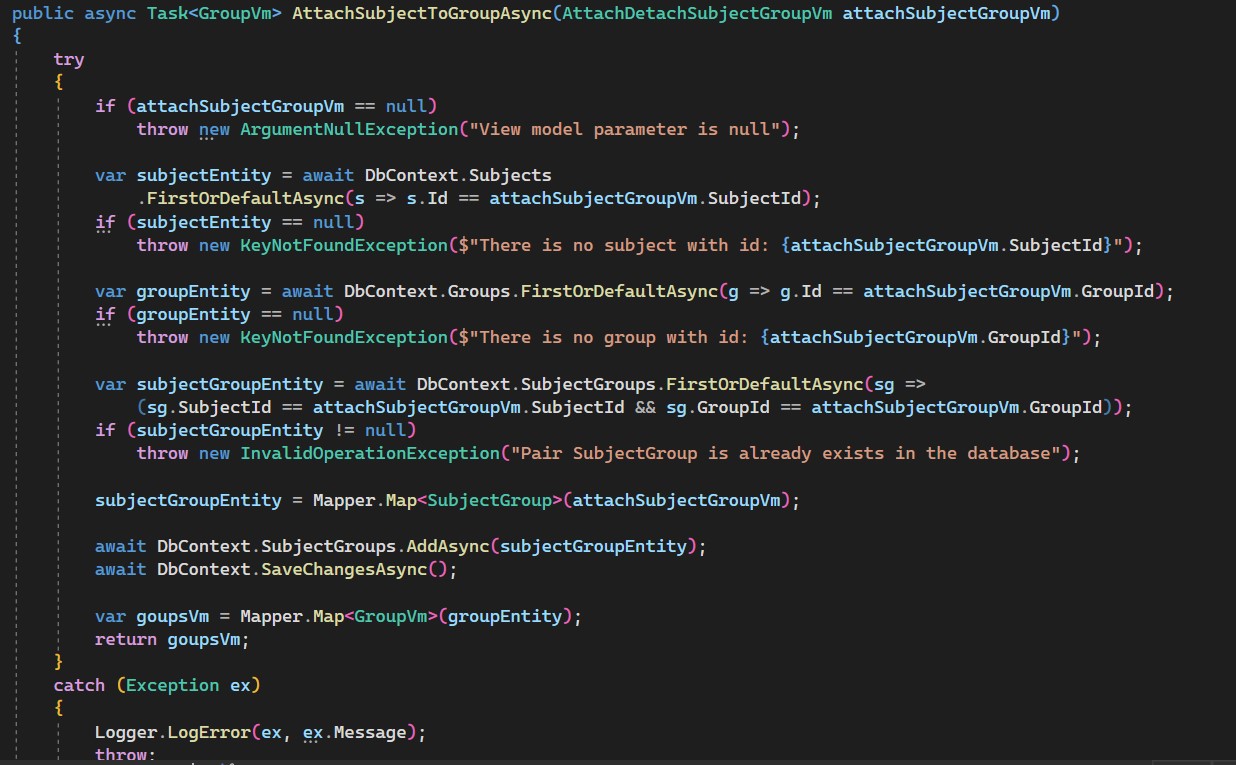 - Admin can edit groups, subjects, attach/detach students to groups.